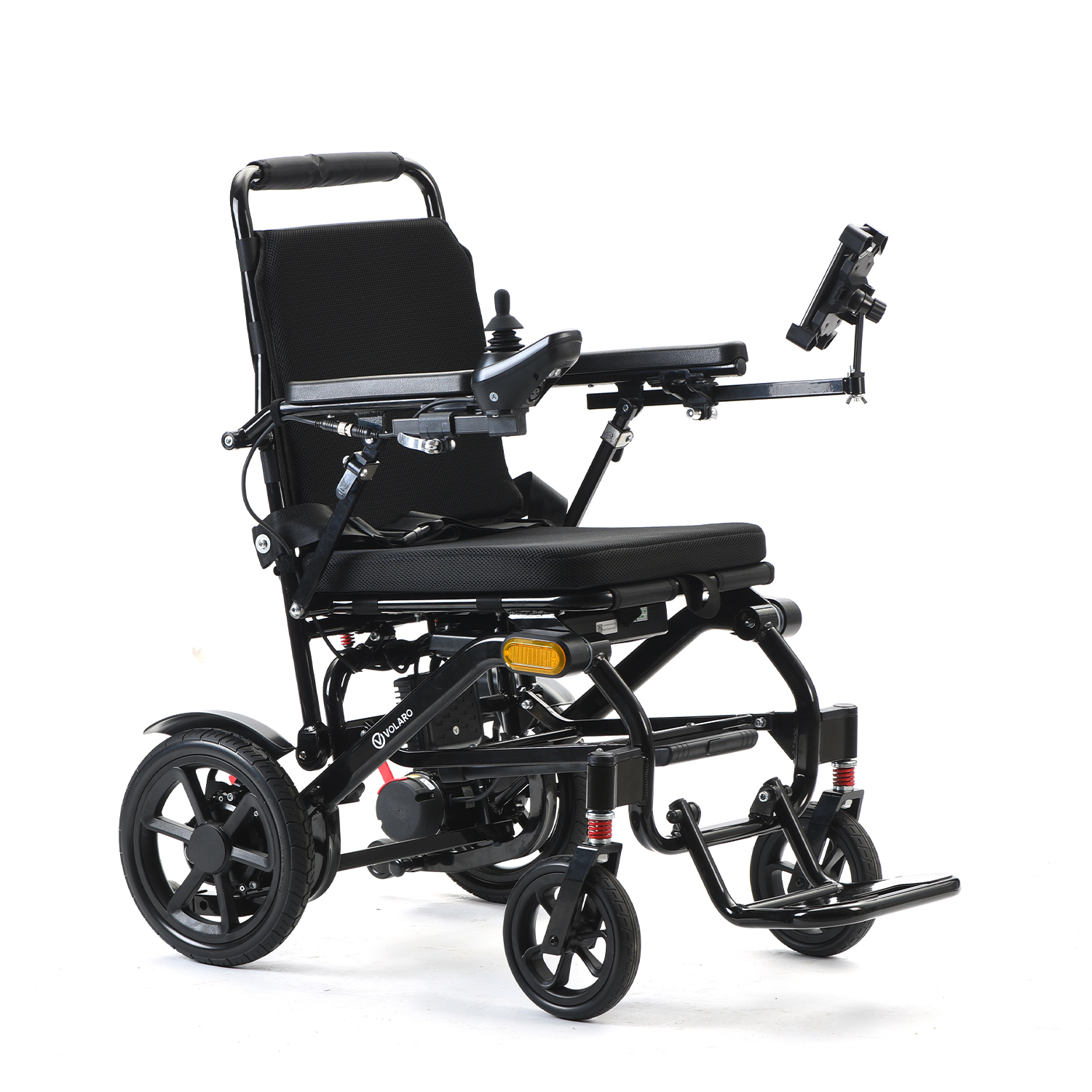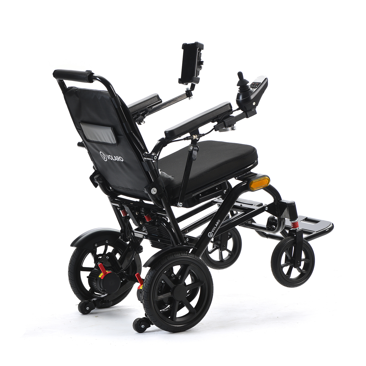 כיסא גלגלים חשמלי עם ידית נשיאה מבית Volaro משלב משקל קל במיוחד, קיפול קומפקטי, מנועים שקטים וג׳ויסטיק LCD חכם. כולל ידית גרירה כמו טרולי ותושבת לפלאפון – מושלם לניידות יומיומית ולטיסות.
