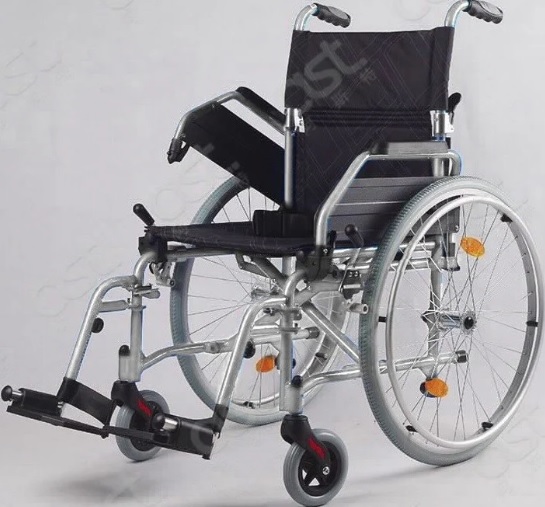 כיסא גלגלים קל משקל ומתקפל, עשוי מאלומיניום איכותי, נוח לשימוש ומתאים לנשיאת אדם במשקל עד 110 ק"ג.