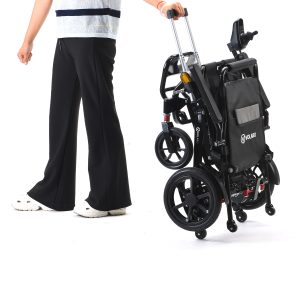 כיסא גלגלים חשמלי עם ידית נשיאה מבית Volaro משלב משקל קל במיוחד, קיפול קומפקטי, מנועים שקטים וג׳ויסטיק LCD חכם. כולל ידית גרירה כמו טרולי ותושבת לפלאפון – מושלם לניידות יומיומית ולטיסות.