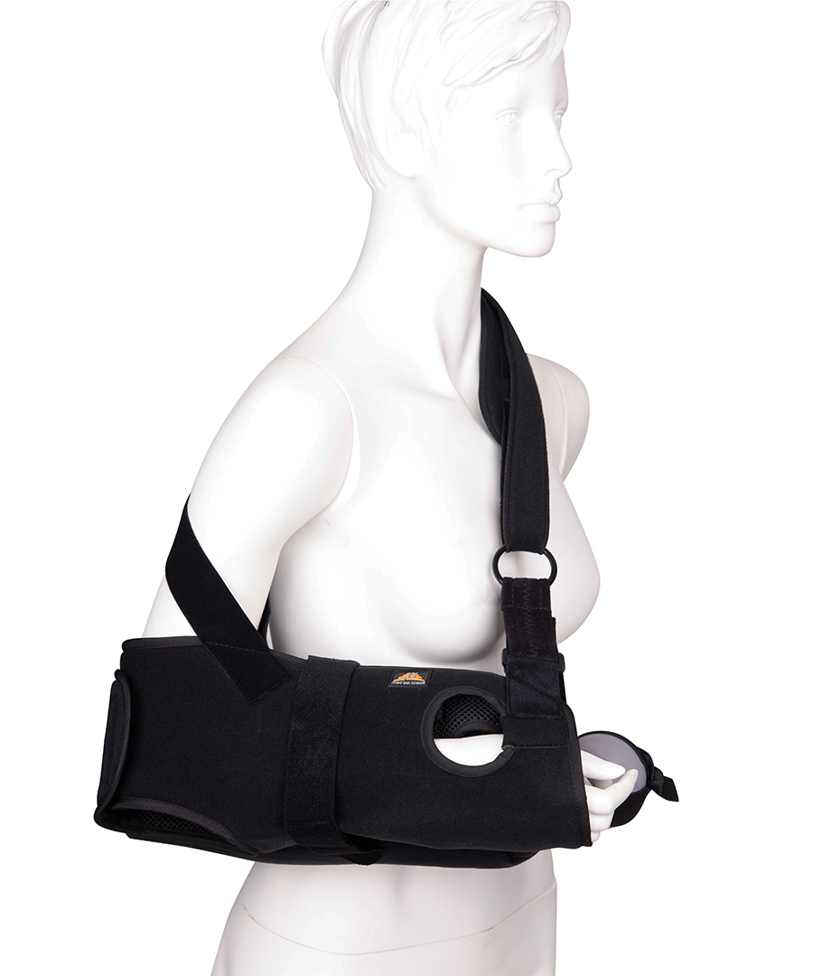מתלה כתף אורתופדי ייעודי לקיבוע הזרוע בתנוחת הרחקה מתונה של כ־10–15 מעלות, המאפשרת תמיכה וייצוב של מפרק הכתף תוך שמירה על מנח אנטומי מבוקר.